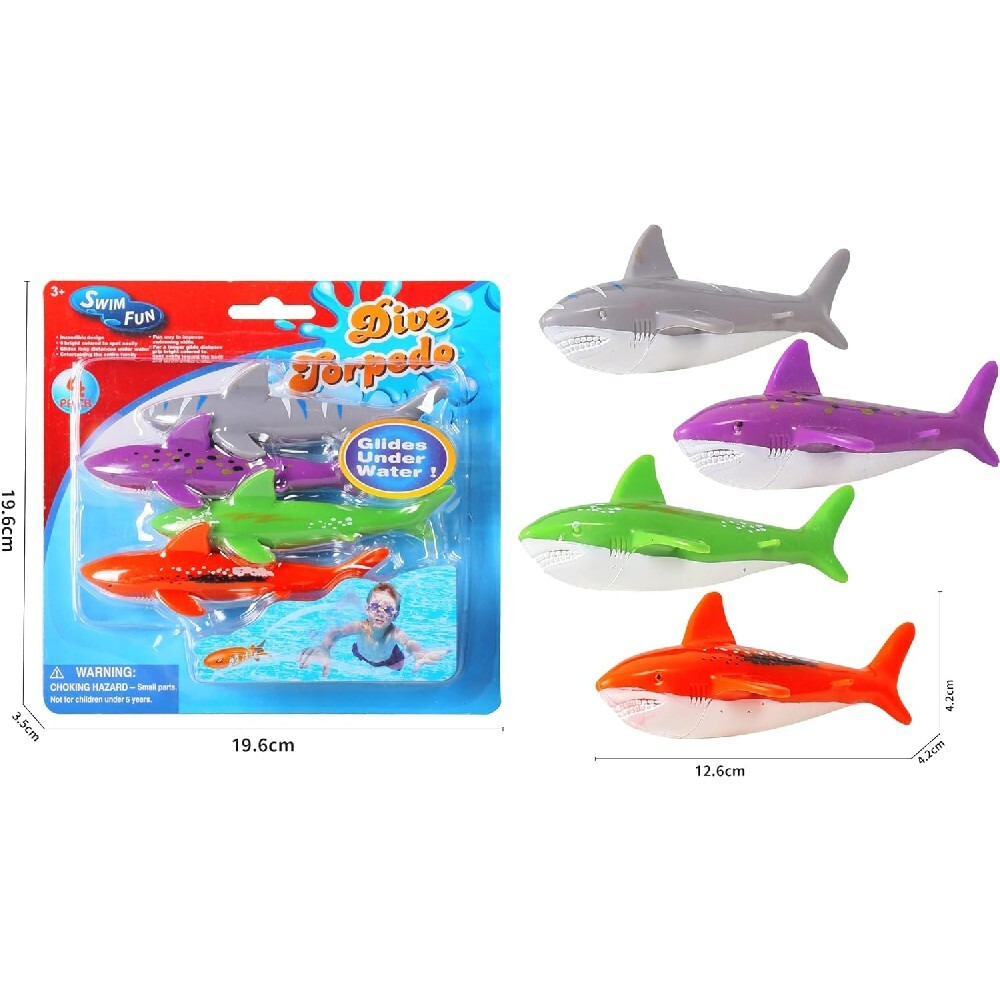Four colors of sharks diving toys that glides long distances under water and easy to see and grab. Fun way to improve swimming skills and entertaining for the entire family. This dive toy isn't just fun—it's a fantastic tool for underwater swimming training. Parents can utilize these sinking toys to help kids master breath-holding skills. Amidst the joy and challenges, children can enhance their swimming abilities while delighting in pool adventures. Get ready for a summer filled with laughter and skill-building! Made of high quality material, durable and harmless. Soft, well elasticity, can stay at the bottom of the pool. Kids enjoy the fun and the challenge,good pool fun while improving swim skills.