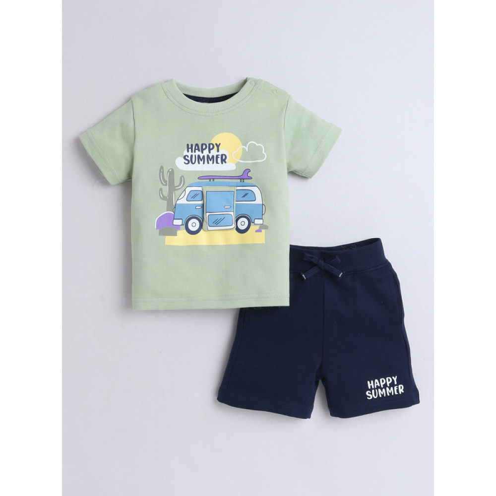 Victor and Jane Infant 2PC Set, Green T-Shirt with Cute Bus And Blue Shorts 18-24M