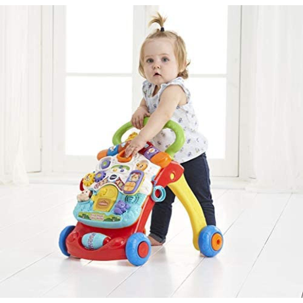 Hi friend! Welcome to our house! Your little one can make friends with all the playful animal characters as you watch them take their first steps with this 2-in-1 walker and activity centre from VTech! The walker features textured wheels, easy grip handle and durable design giving all the support your little one needs to take their first steps. The fun-filled activity panel includes 5 light up buttons, shape sorters, gears, animal buttons & role-play phone and can be removed from the walker for fun sit-down play! Through lots of exciting activities, fun music and friendly phrases, little ones will be introduced to numbers, shapes and animals. Best for ages: 6 to 30 Months Highlights Removable activity panel includes light up buttons, shape sorters, gears, animal buttons & role-play phone. 2 x AA Batteries Required